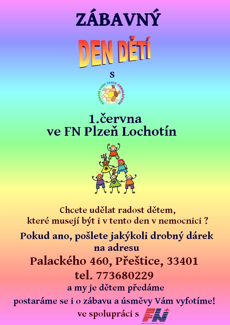 Den dětí bychom letos chtěli oslavit s nemocnými dětmi v Plzeňské nemocnici na Lochotíně. Akcí chceme dětem zpříjemnit jejich svátek, udělat jim radost, rozesmát je :) Přijedou za nimi psovodi, šikovné tety,...